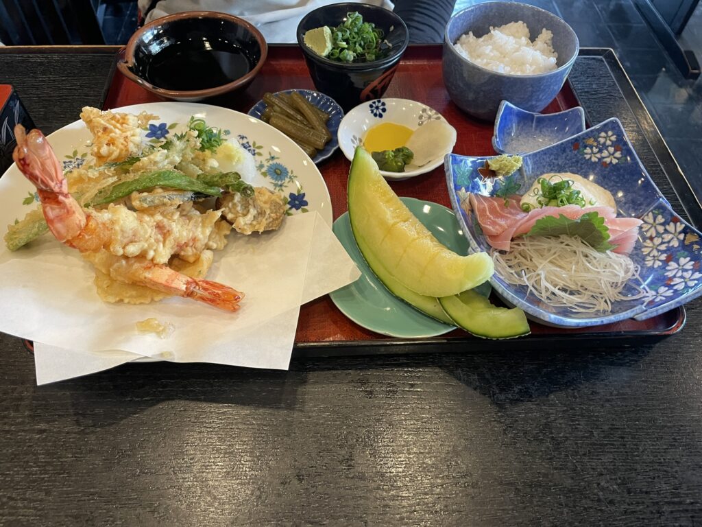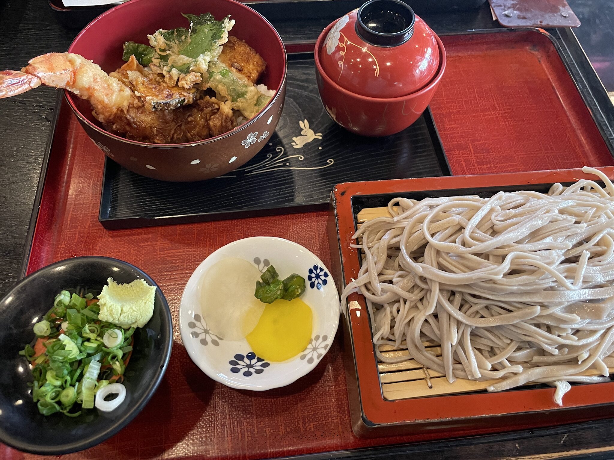 旦那は刺身定食で私は天丼蕎麦定食を頼んだところこのボリューム!!!